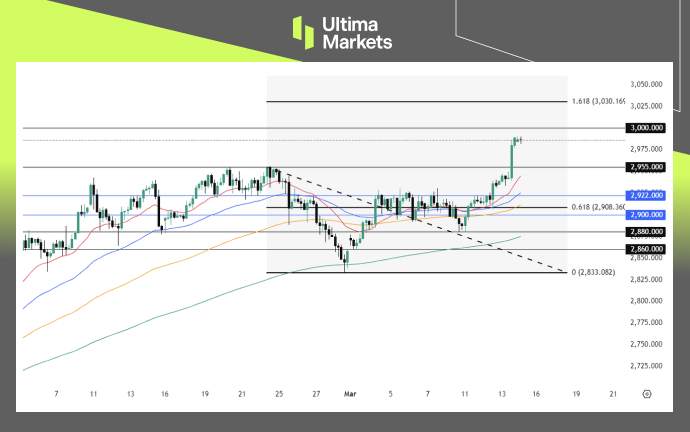 从技术角度来看,此次突破暗示金价可能进一步走高,下一个关键阻力位在3,000美元。此外,根据斐波那契扩展计算,黄金的下一个主要阻力位可能在3,030美元左右。