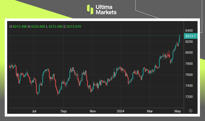 FTSE 100 memiliki kinerja yang kuat pada hari perdagangan setelah Hari Libur Bank Awal Mei. Ini mencapai puncak rekor intraday 8.335,68, mewakili kenaikan 1,49%. Pada akhir sesi, indeks ditutup pada 8.313,67, menandai kenaikan 1,22% untuk hari itu. Kenaikan ini mencerminkan kenaikan dua sesi sebelumnya yang terlihat di seluruh ekuitas Eropa, karena pasar menikmati penurunan suku bunga yang diantisipasi oleh bank-bank global terkemuka.